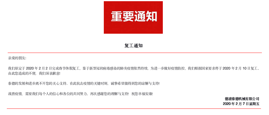 泰德機(jī)械 將于 2020年2月10號(hào)復(fù)工